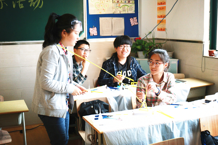 ?这边思维荡漾,那边动手操作正欢。学生们根据自己对结构的理解,搭建着“伸向远方的结构”。 “投石车”赛场热闹无比,投不中目标时的焦虑、投中目标后的兴奋,每一个队都是那样的投入。