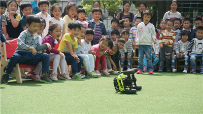 首先引入眼帘的是越野四驱车的“翻山越岭”本领SHOW,在表演队老师娴熟的操控下,两部蓝色越野四驱车爬坡、绕弯、越障碍,你争我夺直奔目的地,风驰电掣的飞车表演让小朋友们连连欢呼拍手。每当越野车经过小朋友们的身边时,孩子们还会友好地和它打招呼,不慎反倒的小车,还有小黄人这位好帮手友好地扶起。