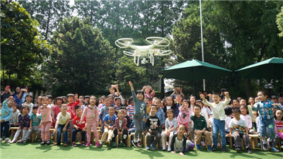 地面表演还不过瘾,螺旋桨声呼呼呼作响,一架四轴无人飞行器“咻”地一下从平地而起飞到了半空,引起了小朋友们的欢呼雀跃,一个个小脑袋瓜儿仰着头,无人机飞到那儿,小“望远镜”就跟到哪儿,飞得更高时,小朋友的欢呼声更是有震耳欲聋的架势!