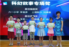 活动现场同时还为在2016杨浦区青少年科幻故事会活动中获奖的选手颁发了奖状和纪念品。杨浦区语言文字工作委员会办公室副主任、语文特级教师储竞老师也出席了本次活动。杨浦区语言文字工作委员会办公室副主任、语文特级教师储竞老师为获得"科幻故事专项奖"的小选手们颁奖。