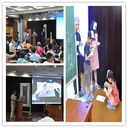 法医是做什么的?他们的工作内容有哪些?他们会在什么场合下出现?法医鉴定又需要用到哪些仪器?孩子们带着这些疑问来到了现场,听饶教授的讲座听得如此入神。瞧!他们还记着笔记呢!活动现场高潮迭起,孩子们最欢乐的就是情景剧互动部分了,都举手踊跃参加呢!被选中参与勘察现场的孩子,穿好鞋套、戴好帽子和手套,跟着警察叔叔在凌乱的屋内,开始了采样之旅;他们可认真了呢,个个小心翼翼的,生怕破坏了犯罪现场。通过互动和教授的解释,他们不但知道了现场采样要注意些什么,还了解了如何采集血样做DNA比对等高科技手段,获益匪浅。