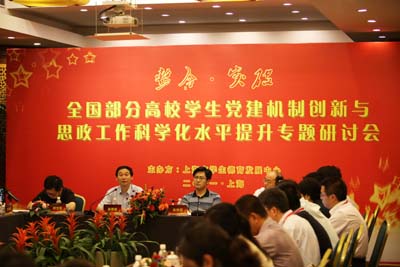 在此背景下,在教育部思政司和社科中心的关心支持下,在市教卫党委、市教委分管领导的重视和有关部处的大力协同下,由上海市学生德育发展中心设计、举办的“‘整合·突破’—全国部分高校学生党建机制创新与思政工作科学化水平提升专题研讨会”于6月24日、25日在上海宾馆举行。教育部高等学校社会发展研究中心主任冯刚同志、教育部思政司思政处处长徐艳国同志做了重要讲话,市教卫党委副书记、市教委副主任高德毅同志出席研讨会开幕式并致辞。来自北京大学、武汉大学、湖南大学、四川大学、深圳大学和上海复旦大学、上海交通大学、同济大学、华东师范大学等高校的部分从事学生党建与思想政治教育工作的专家学者及部分一线学生党建与思想政治教育工作者共60余人参加了会议。