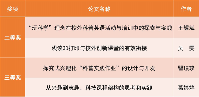 由中国青少年科技辅导员协会面向全国中小学和校外机构的广大科技辅导员开展的第24届全国青少年科技辅导员论文征集活动结果日前已揭晓,经协会理论工作委员会组建的评委会评审,全国共有10篇论文荣获一等奖;75篇论文荣获二等奖;187篇论文荣获三等奖,其中,就有来自杨浦少科站四位青年教师执笔的科研论文,分别获得了二等奖2项和三等奖2项的好成绩。