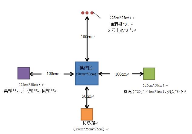 4、赛场。操作区在赛场中间(宽50cm,长50cm),后方50cm处有一个垃圾箱(宽25cm,长25cm,高25cm),操作区左侧和右侧100cm处各有一个网球区和乒乓球区,内有桌球3个,乒乓球3个、网球3个。操作区前方100cm处还有3个啤酒瓶、3节5号电池。(详见图示)