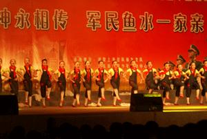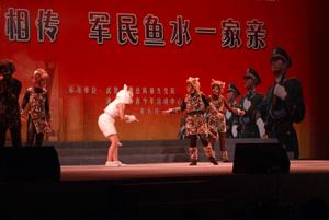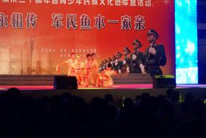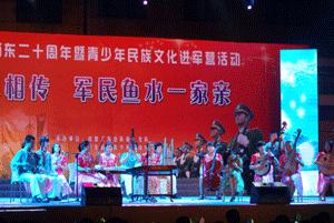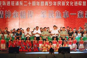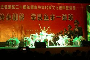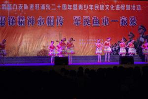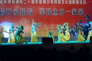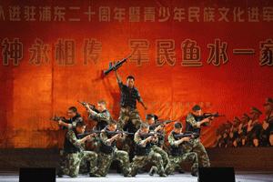 ?????? ?8月1日,在建军85周年的光辉日子里,我们浦东新区青少年活动中心的师生们带着对“钢铁长城”的崇敬之心,带着对“最可爱的人”的崇敬之情,走进武警上海总队第九支队的军营,开展了“雷锋精神永相传 军民鱼水一家亲”——2012年青少年民族文化进军营活动。 ??????? 武警九支队、区文明办、区教育局、区民政局、区双拥办、周家渡街道和青少年活动中心的领导与武警九支队的1000多名官兵们一起参加了活动。 活动中,上海武警总队第九支队的政委吴方泽上校致欢迎辞,区教育局郁时炼副局长致辞。之后,中心舞蹈团表演了《茉莉花》《我的偶像》《朝霞》《我的铃儿响叮当》、武术团表演了《武林小子》、民乐团演奏了《渔歌》、戏剧表演团的音乐剧《大老鼠和小老虎》赢得了阵阵掌声;教师独唱《英雄》《一杯美酒》《望月》;区教工舞蹈团带去的《溜溜康定 溜溜情》《我的祖国》和武警官兵的男子舞蹈《士兵突击》、说唱《忠诚誓言》;军民古筝合奏《将军令》等节目体现了军民同欢乐、共庆贺,齐传承的节日景象。 ??????? 多年来,青少年民族文化培训(浦东点)活动持续、蓬勃开展,惠及了十万多人次,大家不分男女、不分老少,甚至不分国界,聚在一起扬中华民族文化之风,传中华民族文化之神,树中华民族文化之魂,扎中华民族文化之根。