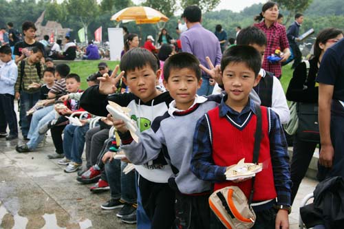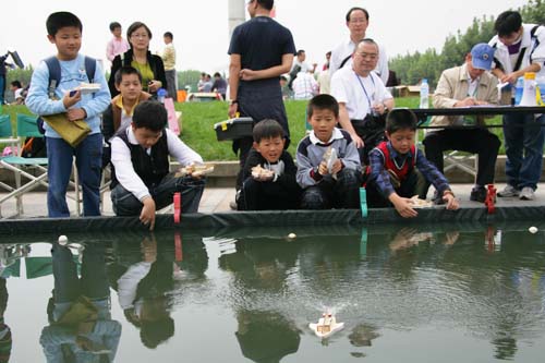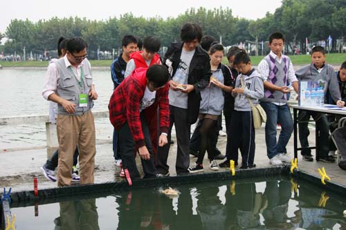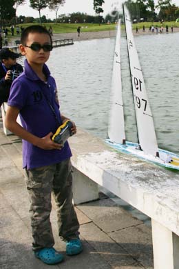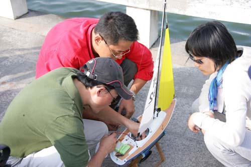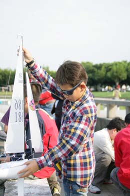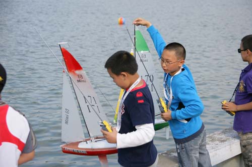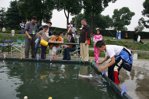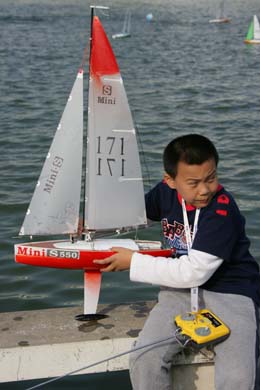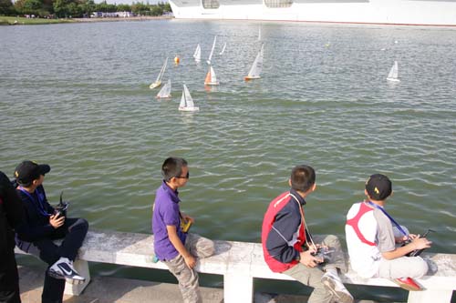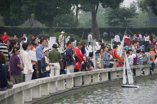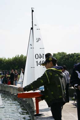 本届模型节的船模项目分为三个类型的比赛。自航船模的比赛以速度快,航向准确为评判标准。在自航船模的水池边上,选手们小心翼翼地确定自己的船模不会偏离航向。遥控船模更是吸引了众人的眼球,各路选手指挥着自己的船只以最短的时间绕行规定的8字标。国防园的湖面上白帆点点,和蓝天碧水一起构成了一道亮丽的风景线。