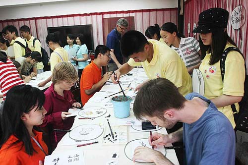 除了音乐欣赏,“中华文化之旅”活动内容还包括了描画团扇、穿彩珠、软陶制作、欣赏皮影戏等环节。在描画团扇的工作室,志愿者和少年宫的孩子们都成了传播中华文化的小老师。他们手把手教德国的营员写毛笔字,“福”字代表运气,“福”字倒着写则表示运气找到你了。浅显易懂的解释,让德国的小营员们纷纷点头,并按照自己的喜好将可爱的图案描绘在团扇上。他们甚至学会了写自己的中国名字,每个人拿着写有“玛丽安”、“弗朗杰西卡”、“索菲亚”等名字的专属团扇,笑意盈盈地与少年宫老师小朋友们挥手告别。