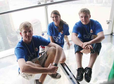 ??? 在东方明珠263米主观光层,同学们饶有兴致地透过球形玻璃幕墙,360°远眺上海。“好美啊!”汉堡音乐学院手风琴乐团的德国女孩Franziska Hohensee发出由衷的感慨,“你们生活在上海这个美丽的城市,太幸福了,我好羡慕你们!”而当他们来到259米悬空观光廊时,透过脚底下透明的玻璃地面看到陆家嘴的风景时,更是惊讶得说不出话来,双眼不够用,拍照拍不够。孩子们还鼓起勇气站在玻璃地板上,做出仰卧的姿势,用相机留住这难得的瞬间。
