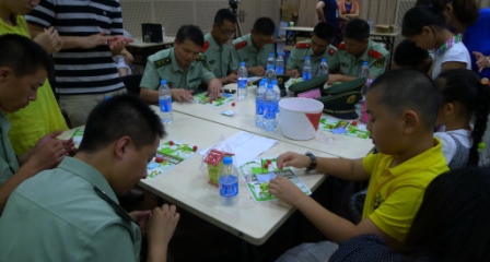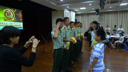 当代军人是一面旗帜,一种精神,是我们心中最可爱的人!为了庆贺2012年八一建军节,7月28日上午,长宁区少年宫举行了 “小手牵大手,共享八一情”长宁区中小学生庆祝八一建军节主题活动。本次活动由长宁区少年宫、武警长宁中队、新泾镇团委联合主办。