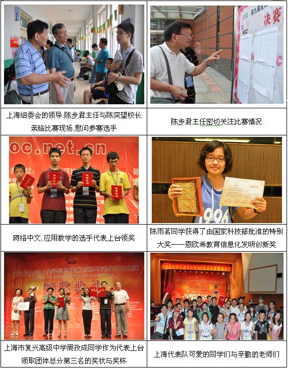 本次决赛共分13个项目,其中,上海代表队参加了其中的动画制作、漫画创作、主题网页探究、视频创作、发明创新、网络中文、应用数学、虚拟机器人共8个项目,来自全市20个学校的30名学生以良好的竞赛素质,饱满的竞技状态投入到了赛事中去。在全体师生的共同努力下,上海代表队取得了团体总分第三名的好成绩?其中上海市第三女子中学的陈雨茗同学获得了由国家科技部批准的特别大奖——恩欧希教育信息化发明创新奖;另外,获得个人20个一等奖;2个二等奖;2个三等奖?复兴高级中学的陈妍妍同学也成为DV项目前十名中唯一的大陆地区参赛队员,并接受了北京青年报的采访。