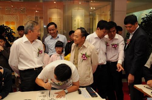 与会领导为嘉定、松江两区获奖学生颁发了荣誉证书。展厅内一幅幅精心装裱的作品和获奖学生代表的现场书法表演洋溢着浓郁的翰墨馨香,让大家感受到了流动在黑与白之间独特的文化韵味。仪式上,“舟山市龙山船厂有限公司”董事长吴建军向书法艺术奖基金捐赠20万元。
