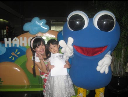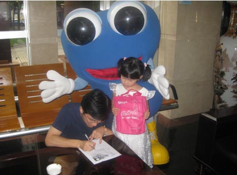 图为小朋友的父亲在哈哈吉祥物的陪同下填写报名表,他对于女儿在故事大赛上的表演一定很期待吧。小朋友手拿着乳加力赠送的大礼包,认真地注视着正在填写报名表的父亲,对于即将到来的比赛,她早已迫不及待,准备一展身手了!