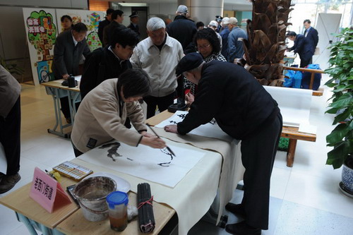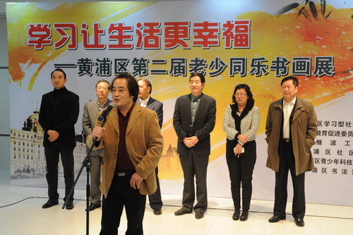 “学习让生活更幸福”——黄浦区第二届老少同乐书画展于2012年上午九时三十分在黄浦区青少年科技活动中心底楼大厅开幕。本次活动由黄浦区学习型社会建设与终生教育促进委员会办公室主办,郑继波工作室、黄浦区社区学院、黄浦区青少年科技活动中心承办,南京东路街道社文科、外滩街道社文科、瑞金二路街道、淮海中路街道、豫园街道、打浦桥街道、老西门街道、小东门街道、五里桥街道、半淞园路街道的社文科、宣教科、社区学校以及黄浦区书法家协会的大力支持下得以顺利展出。黄浦区教育局党工委书记唐海宝;黄浦区教育副局长江伟鸣;黄浦区教育学院书记赵其坤;黄浦区社区学院副院长涂丽敏;中共黄浦区委宣传部副部长、黄浦区书法家协会主席张伟舫;上海市书法家协会理事、黄浦区书法家协会常务副主席兼秘书长吕颂宪等领导、专家出席了本次活动。
