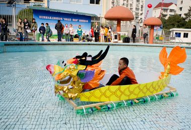 本届模型大赛又有新的亮点,在原来太阳能车船模的基础上,结合今年龙年的寓意,创新增添了载人“龙船”。在少科站专职科技教师的指导下,学生们利用空的可乐瓶,将柠檬酸和小苏打倒入其中,使瓶中充满气体,并捆绑于支架两边,形成一个双体船。利用太阳能板作为能量来源,在行驶过程中转化为电能,使马达迅速运转起来,在马达上安装明轮控制方向。在现场,一艘艘龙船外观栩栩如生,制作精良,龙头、龙身部分利用着色KT板或彩色绒布串联钢丝包覆,船体自身重达20斤,实际承载重量可达40公斤,中小学生可轻松自如地驾驶着龙船穿梭在水池中,别有一番新意。