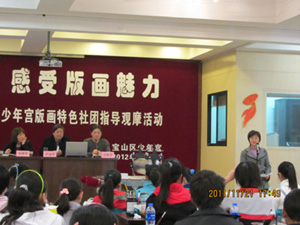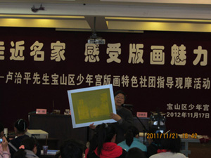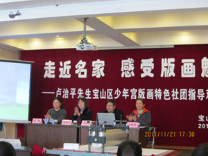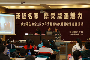 活动由版画特色社团指导老师金悦主持,沙林芬书记代表宝山区少年宫致欢迎词,并向前来参加活动的各位来宾介绍了卢治平先生的简历,现场师生亦用热烈的掌声对卢治平先生百忙中抽时间来到宝山作指导表示热烈的欢迎。