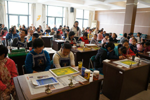 当卢治平老师走下讲台,亲自指导大家制作丝网版画时,场内沸腾了!在场师生为能现场一睹版画名家的演示风采而激动万分,大家群情激昂,但又秩序井然地分批观摩了卢老师的指导。少年厅内,洋溢着浓浓的版画学术氛围,师生们争相一试。当一幅幅精美的、栩栩如生的作品在大师的指导下新鲜出炉,活动推向了高潮。大家围着版画家卢治平老师,久久不愿离去。