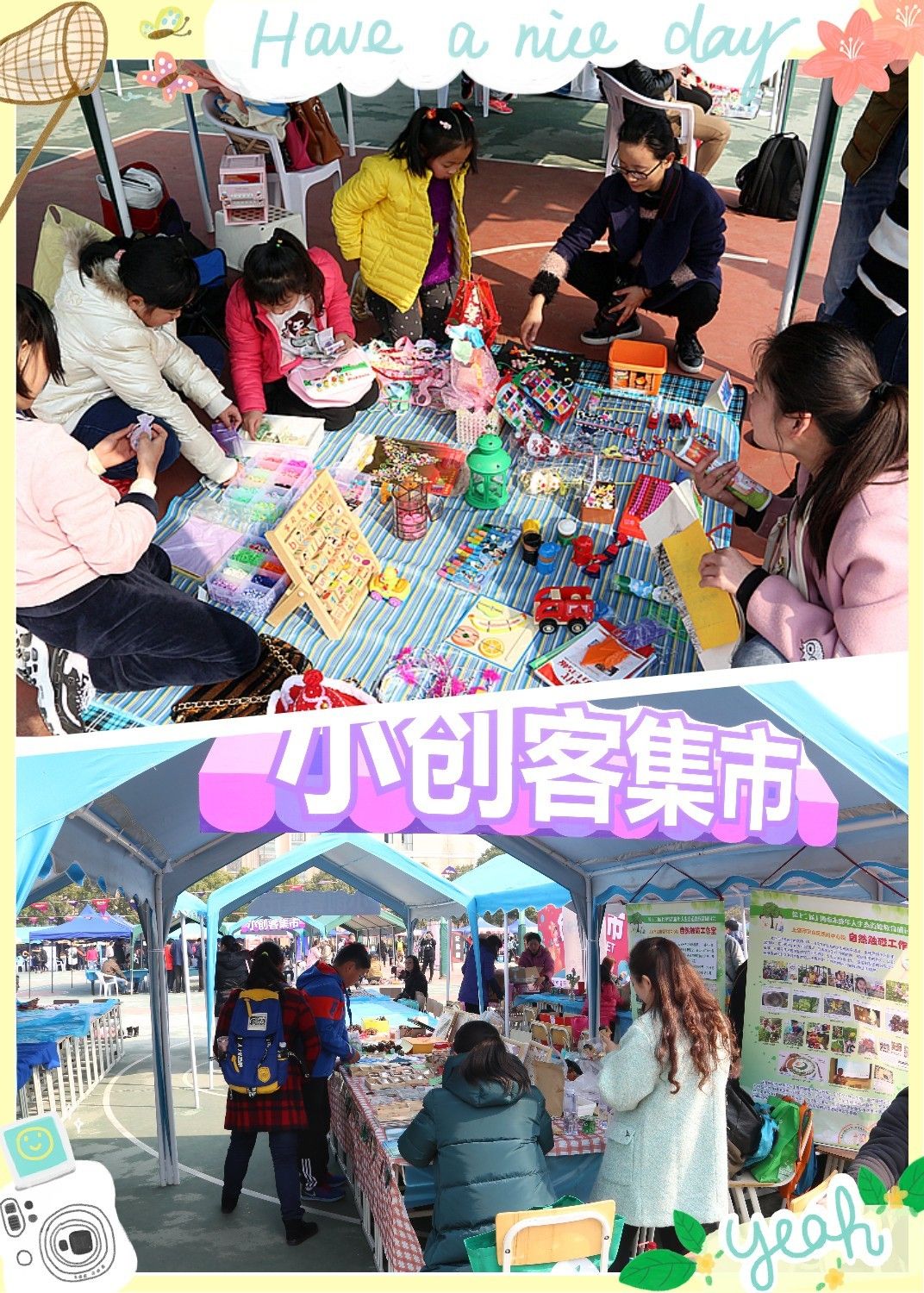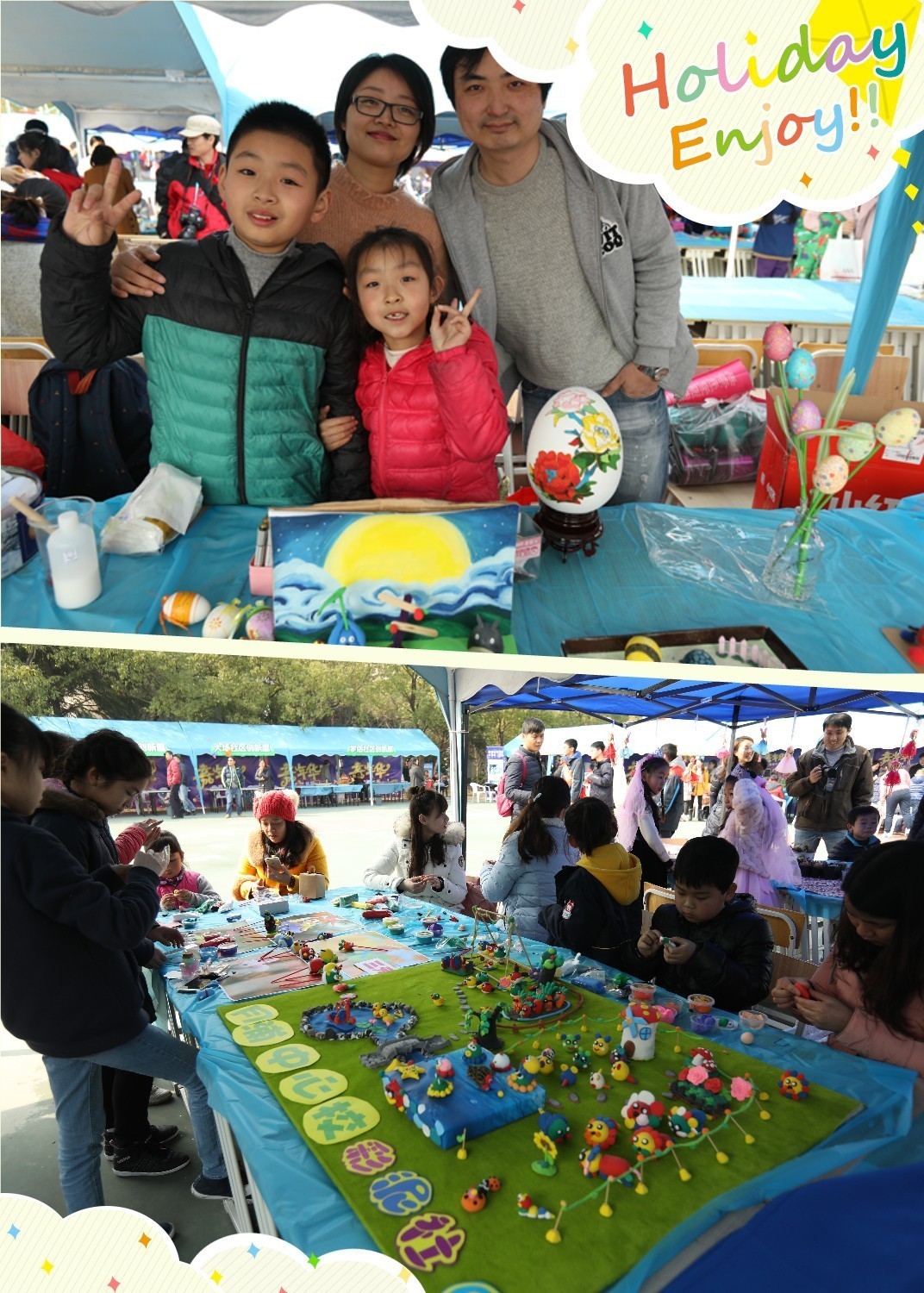 九十多个互动体验的展棚绕着操场四周一直排开,春意盎然,阳光普照,趣味的游戏活动吸引众多学生、家长参与。