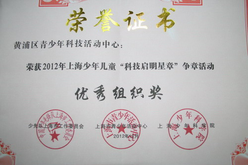 黄浦区海华小学丁佳琪同学和市八初级中学方思聪同学在这次表彰活动中荣获了2012年上海少年儿童“科技启明星章”银章,黄浦区新凌小学刘滨榕同学、七色光小学孙昊天同学、比乐中学陆惠君同学等28位同学荣获2012年上海少年儿童“科技启明星章”铜章。黄浦区科技辅导老师葛玉琴、倪佳燕和黄蔚敏获得了上海青少年科技启明星章争章活动优秀辅导奖。