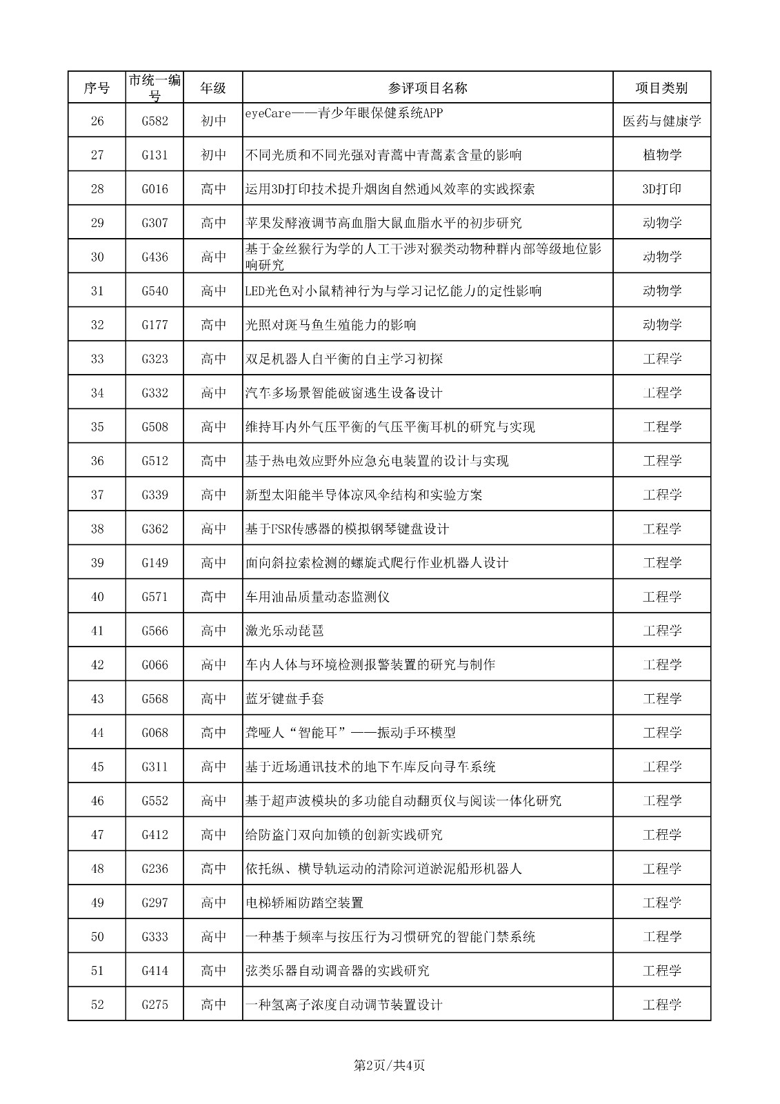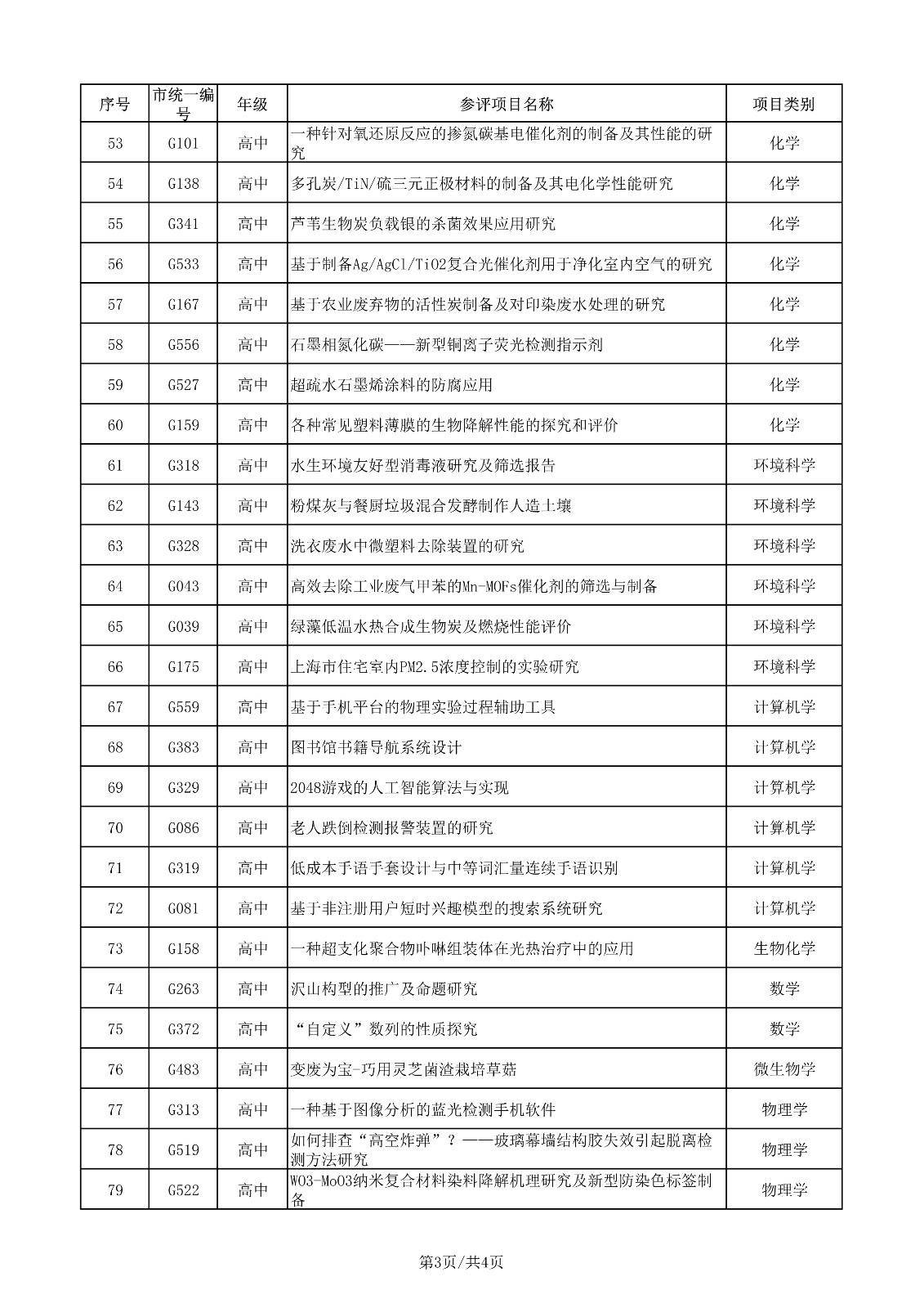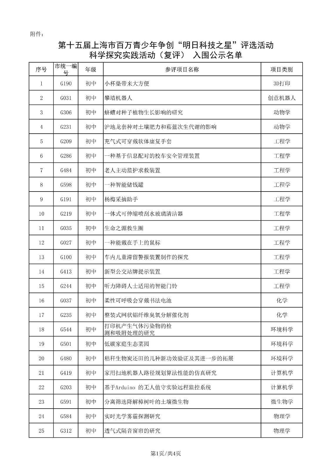 第十五届上海市百万青少年争创“明日科技之星”评选活动科学探究实践活动(复评) 入围公示名单