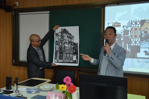 李守白从海派剪纸代表人物,南北派剪纸区别、分布、种类、工具、作品欣赏几个部分进行了详细讲解。现场示范环节,根据主题“春”,即兴在宣纸上用毛笔绘画出一幅上海女人的剪纸样稿,学员们对其扎实的造型能力感叹不已。随后现场的老师根据指导,在蜡盘上用刻刀刻制福娃小稿。为了保证形象的准确,学员们遵循先刻细部或紧要处,再由中心慢慢向四周刻,刀的顺序如同写字一样由上到下、由左到右、由小到大、由细到粗、由局部到整体。学员们在刻的过程中碰到任何问题,李守白都会悉心示范、指导。
