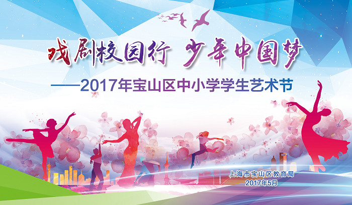 5月18日至19日,2017年宝山区中小学学生艺术节活动在宝山区少年宫和培智学校隆重举行。本届学生艺术节以“戏剧校园行·少年中国梦”为主题,分设校园剧课本剧、少儿歌舞剧、诗歌朗诵、合唱四个专场,报送了近200个节目,3300多人次参加活动。