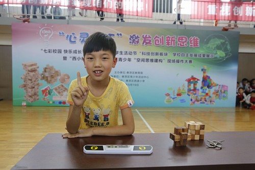 5月19日下午,奉贤区第三届学生活动节“科技创新板块”第二场学校自主展示活动,暨“西小杯”第三届奉贤区青少年“空间思维建构”现场挑战赛在西渡小学隆重举行。“空间思维建构”现场活动是奉贤区青少年科技创新教育的试探性工程,这项活动是依据波兰科技学院著名教授贝那兹(Lukasz Bednarz)所提出的:“空间思维是一个控制杆,它能够通过学习使得学生对事物的了解更深刻,具有更深的洞察力”的理论而设计的一项注重“手脑并用”、突出“创新思维”培养的新型活动模式。本届赛事共有近40所中小学参与,在学?!昂Q 被∩瞎餐萍?50多名中小学生进入区级现场个人挑战赛和学校团体挑战赛。