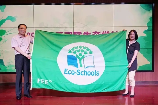 杨浦区环保局法制科科长张卿为复旦科技园小学授2016年度国际生态学校绿旗荣誉旗。鼓励各校在今后的教育教学和活动中继续认真做好环保节能教育,使校园“绿色常驻”!