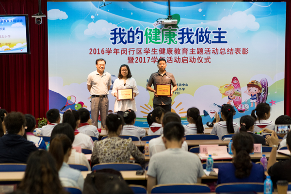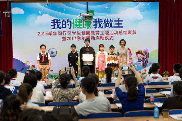 “护牙爱眼小课堂、急救仿真体验、‘目’浴阳光,精彩世界......”来宾们饶有兴趣地驻足体验,丰富多彩的外场活动之后就是内场的表彰活动。一部精彩的短片,带我们回顾了2016学年闵行健康教育的精彩瞬间,融实践体验、知识竞赛、小品表演、辩论赛等不同形式的闵行区健康教育主题系列活动迄今已走过了六个年头。2016学年在市、区各级领导的支持下,闵行健康教育再一次取得了累累硕果。与会的领导为在各类比赛中获奖的学生、学校代表颁发了奖状。“太极、小品、游戏、健身操”让整个表彰形式庄重而又不失“活泼”。乔慧芳副局长对我区2016健康教育主题活动获得的成果表示肯定和感谢。她希望我们的健康教育在逐渐覆盖外来务工子女群体的基础上让闵行所有的孩子养成健康意识与公共卫生意识,掌握必要的健康知识和技能,促进学生自觉采纳和保持有益于健康的行为和生活方式,同时,对2017学年的健康教育工作也提出了新的目标和希望。
