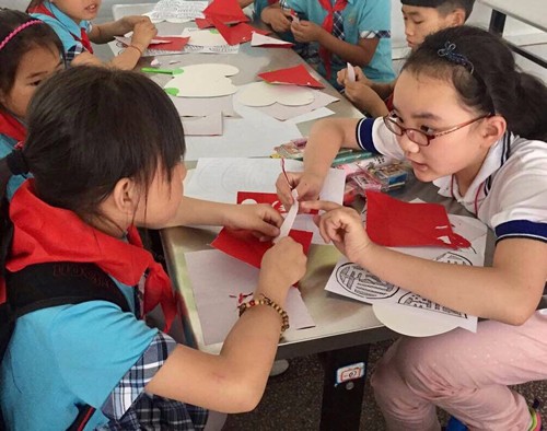 ??撕纸,是我国民间艺术中的一朵奇葩,是中华民族的艺术瑰宝,是世界非物质文化遗产保护项目。“南桥撕纸”以其中国红的色彩、表现技法多样、作品创造的灵性柔和,深得学生和广大群众的喜爱,已成为奉贤非遗文化的一颗璀璨之星。到达务川后,孩子们为当地小学生带去了自己精美的撕纸作品,并手把手地教他们撕纸的基础技艺。当地的孩子用热情的歌舞表演欢迎远道而来的上海朋友。在互相交流中孩子们很快地建立了纯真的友谊。