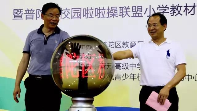 普陀区啦啦操队在活动中进行了项目展示,她们来自区内各所学校,曾荣获全国啦啦操锦标赛(上海站)花球啦啦组规定动作冠军、全国啦啦操锦标赛花球啦啦组规定动作冠军和大课间示范动作冠军。小运动员们伴随着音乐熟练的完成了每一个动作,让在场师生、家长领略到热情洋溢的啦啦操项目风采。与会领导和嘉宾共同为学校代表赠授普陀区校园啦啦操联盟小学教材,该教材由区青少年中心与项目专家联合编撰,是小学啦啦操的基础教程,为校园啦啦操推广和提升提供了有力的支撑。普陀区教育党工委副书记、纪工委书记、教育局副局长黄敏华宣布了“快乐运动、健康成长”体育夏令营正式启动,与区体育局副局长杨建新共同开启活动旋转球。