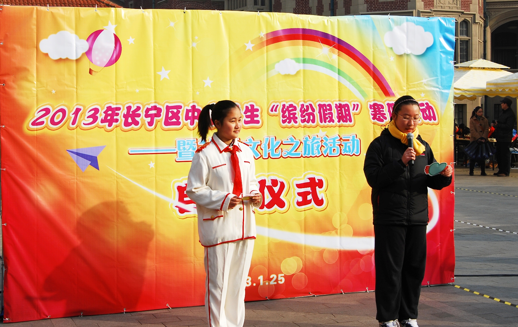 2013年1月25日一早,长宁区各校的学生代表以及社区的爷爷奶奶们都汇聚在长宁区少年宫的广场上,在一片军鼓齐鸣声中,2013年长宁区中小学生“缤纷假期”寒假活动暨社区文化之旅活动拉开了序幕。