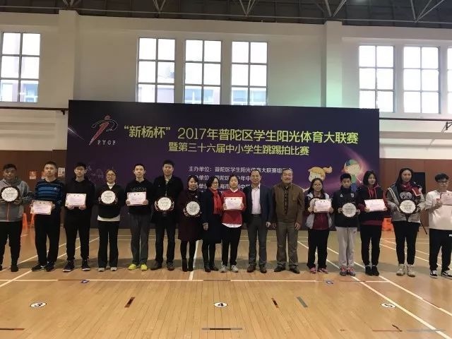 11月18日,“新杨杯”2017年普陀区学生阳光体育大联赛暨普陀区中小学生第三十六届跳踢拍比赛在上海市新杨中学体育馆圆满落幕。来自普陀区46个学校1200多名运动员同台竞技,场面非常壮大。普陀区教育局副局长黄敏华、普陀区教育局基教科科长葛伟、普陀区体育局竞技科科长刘丽娜、普陀区新杨中学校长徐跃进、上海市花样跳绳协会秘书长李胜席等领导和嘉宾出席了本次比赛,并为获奖队伍颁奖。