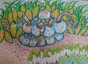 此画的主题反映了对改善地球自然环境的愿望,创意是希望发明有机污染物转换车,它在提取庄稼地土壤里的污染物质的同时又把它们转化成肥料还给土地,给庄稼施肥,一举二得。作者对环境的感受细致真切,想象合理且浪漫,画面清新自然,充分地表达了中国儿童朴素天真的感情又不乏富有科学精神的想象,得到大赛评委感情的共鸣和认可。