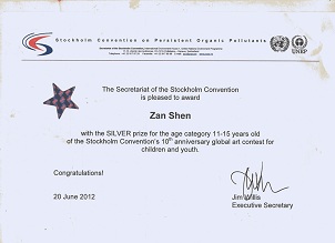 为纪念中国签署《关于持久性有机污染物的斯德哥尔摩公约》十周年,2011年9——10月,国家履行斯德哥尔摩公约工作协调组办公室与环境保护部宣传教育中心联合举办了“全国青少年儿童持久性有机污染物环保艺术大赛”活动。此画参赛获得全国一等奖,2012年3月又被选送参加斯德哥尔摩公约10周年青少年全球艺术大赛。