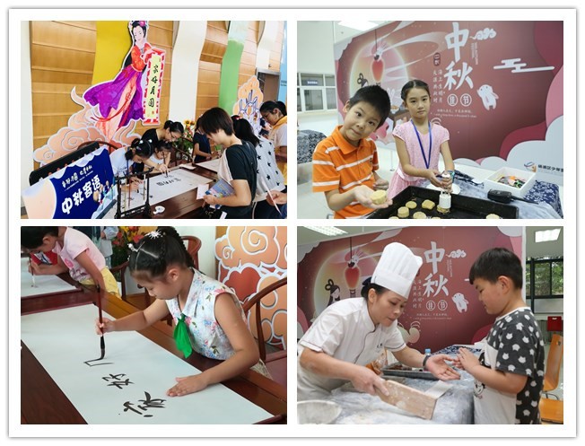 少年宫大厅内装点着中秋佳节应景的水果与花卉,亲子家庭在嫦娥奔月主题背景板下书写中秋寄语,动手制作月饼、吹糖人、吃棉花糖,甜甜蜜蜜迎中秋。