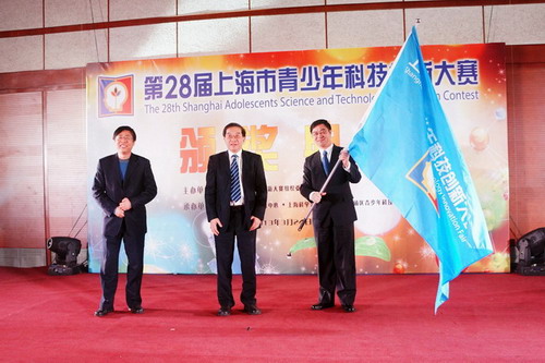 颁奖典礼上,大赛组委会常务副主任、市科协巡视员钱之广从长宁区区委常委、副区长杲云手中接过大赛会旗,交接给第29届上海市青少年科技创新大赛主办区黄浦区副区长吴成。