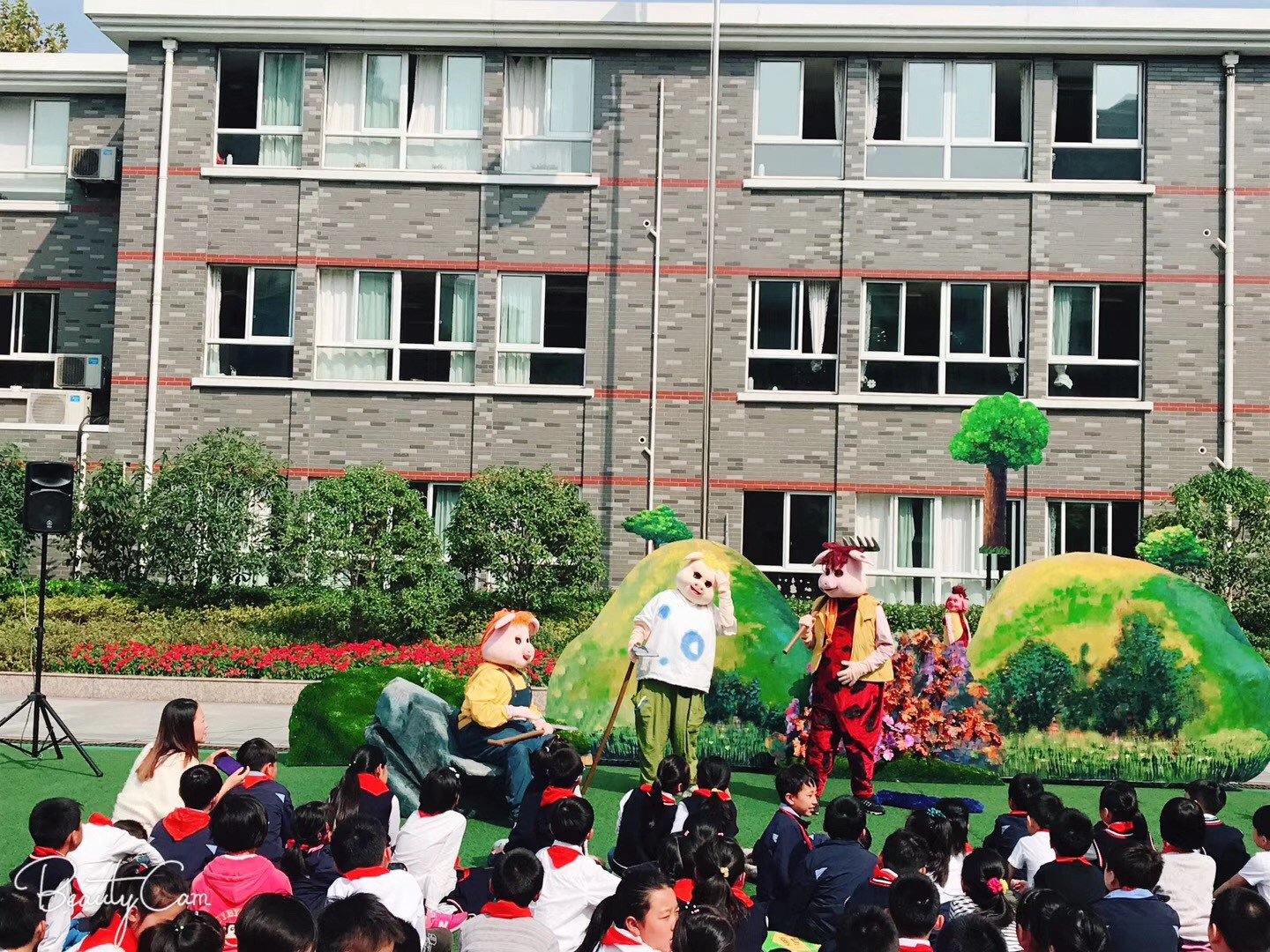 上午偶韵儿童艺术剧团带着优秀儿童木偶剧《三只小猪》来到祥德路小学的校园。工作人员在学校操场上做好舞台搭建和道具的准备工作之后,在学校老师的指挥下各年级整好队伍有序地从教室里出来到操场上指定的位置集合落座。