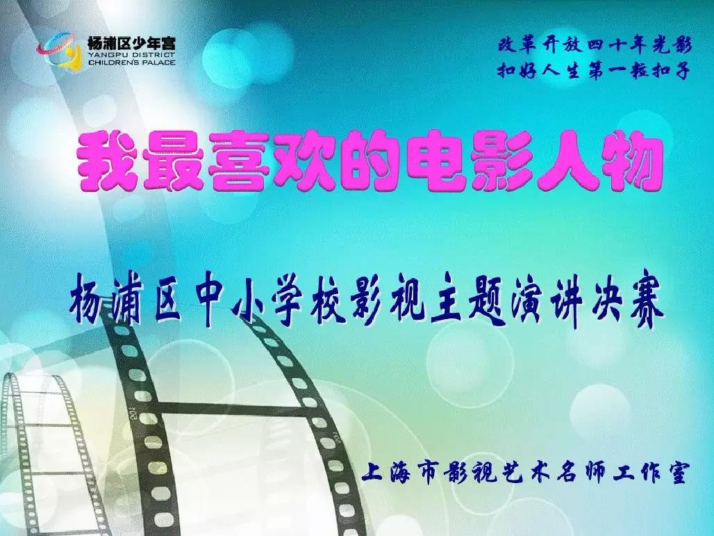 活动根据上海市“百年树人·电影阳光行”影视主题教育系列活动的要求,深入学习贯彻落实习近平新时代中国特色社会主义思想和党的十九大精神,巩固改革开放40年的文化成果,落实立德树人的根本任务,充分发挥优秀影片对中小学生的德育和美育功能,杨浦区少年宫特此举办此次“改革开放的光影40年——我最喜欢的电影人物”杨浦区中小学生影视演讲比赛活动,以此激励广大中小学生珍惜时光、刻苦学习、向善向美,努力成为有知识、有品德、有作为的时代新人,扣好人生第一??圩?。