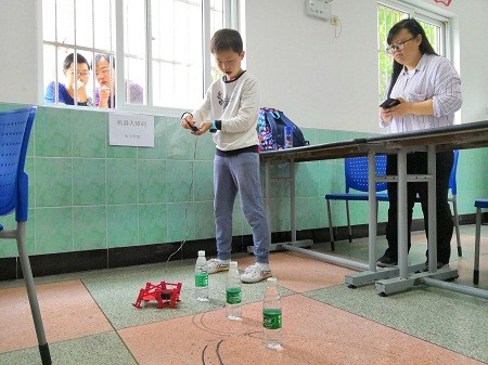 激动人心的比赛陆续开始了!机器人短跑接力比赛是速度的比拼,游戏以最快完成2m短跑的机器人为胜。每支队伍由四台四足机器人组成,团队间的合作,无缝衔接也是致胜的法宝。手摇发电机器人拉雪橇比赛则是力量的较量,在150cm的直线跑道上,要求机器人拖着小车走出指定范围。选手们都紧盯着自己的机器人,在心里默默为它们加油鼓劲?;魅苏习热侨∥Ч廴耸疃嘁彩亲羁佳檠∈植倏鼗魅说哪芰Φ谋热恕U习郎戏胖糜行碧罢习?,参赛机器人须以最短时间避过障碍物,并成功进入终点方作胜利。这个比赛不仅仅考验选手们的机器人各方面的性能,更是对操控机器人能力的有效验证。小选手们看着高手之间的较量,不时地鼓掌叫好。本次竞赛将科技创新实践的成果交流以体育竞技的形式予以呈现,以“更快、更高、更强”的精神激励青少年不断超越自我。