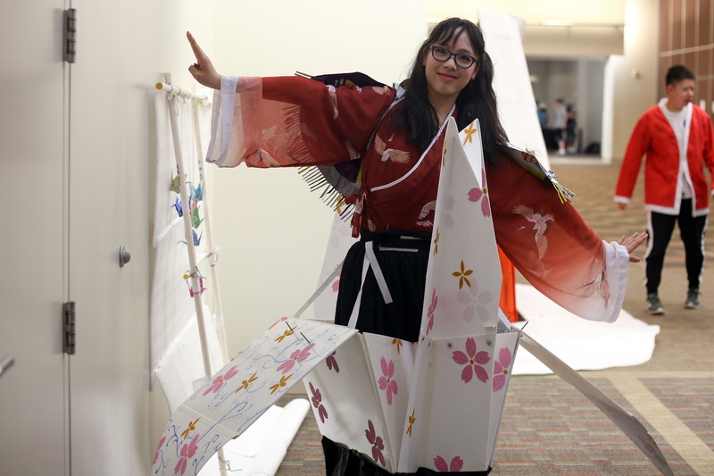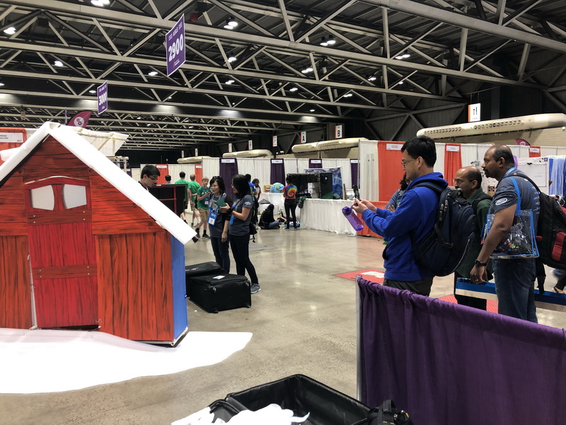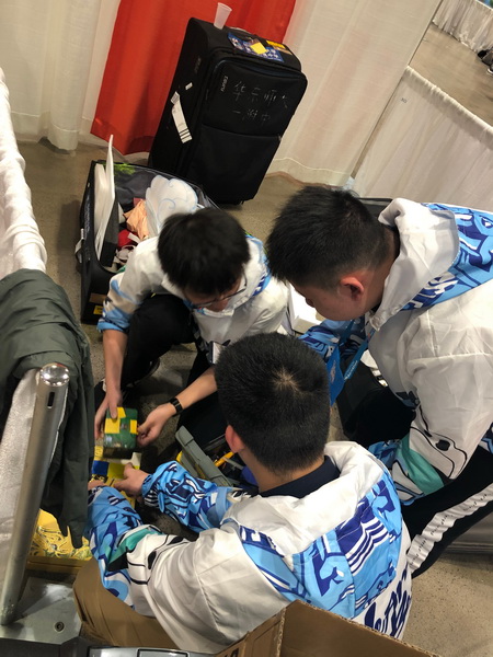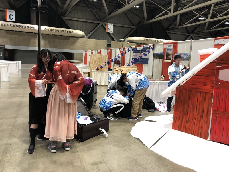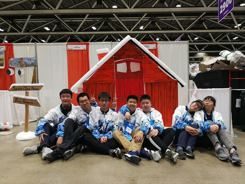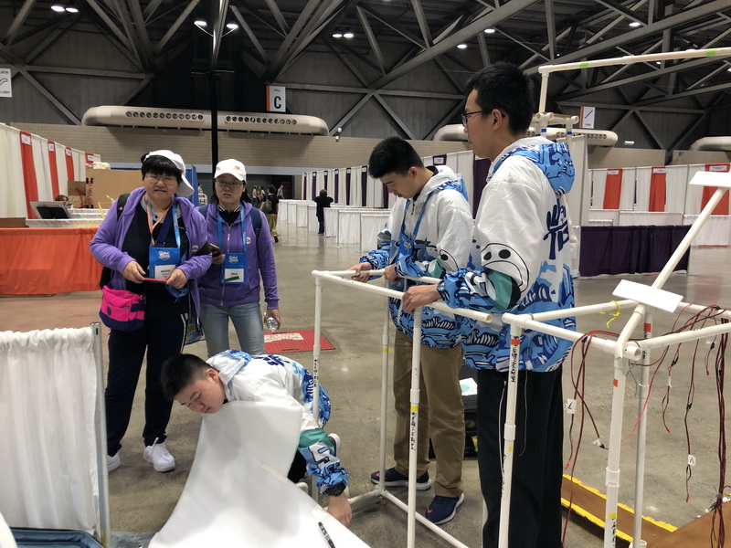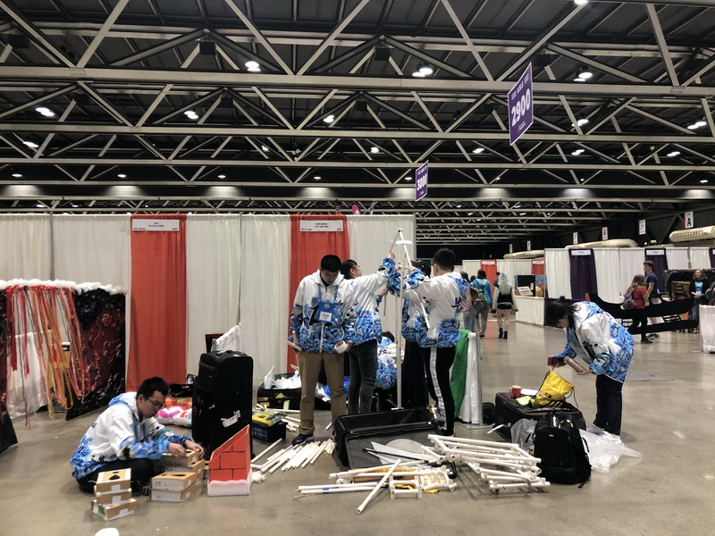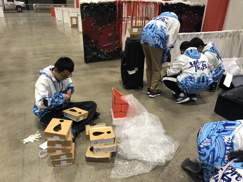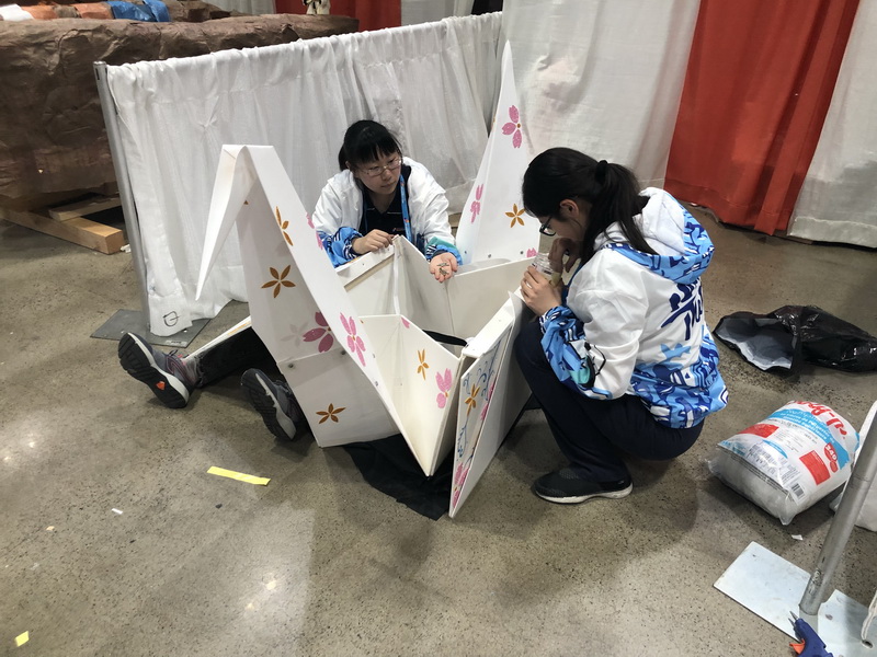 赛前参赛队员将比赛的道具分拆到每一根PVC管,每一颗螺丝,完成非常复杂的道具打包工作,经过一天一夜的行程,带着7个28寸道具箱,跨越13000多公里来到堪萨斯城。第二天,经过10个多小时的道具组装,一栋雪屋平地起,东方纸鹤再现组装区。精致的道具吸引了许多其他国家队伍的围观?!癆wesome!”“Beauiful!”“I love it!” 赞美声络绎不绝,不少队伍预约了第二天要来给中国的Baby Banana观赛加油。由于挑战A高中组别的赛场入口较为狭小,雪屋没有办法整体推入,队员们现场改方案,经过几小时的测试和练习,做到了不影响整体结构的拆分和在几分钟内迅速复原。