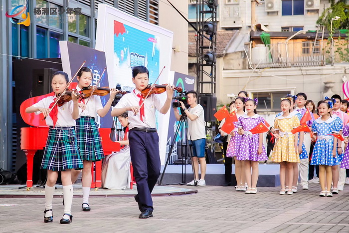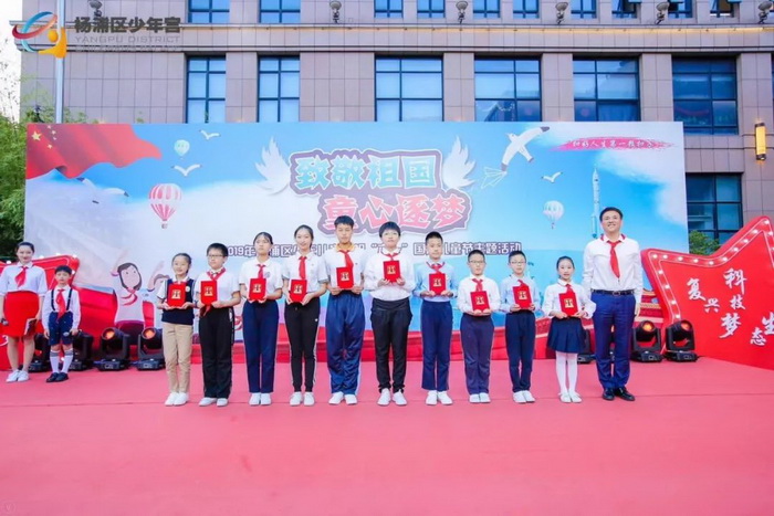 杨浦区红领巾理事会理事代表宣读红领巾“六一”倡议,呼吁全体少先队员致敬祖国、领巾向党、争做好学、自信、立志、创新、向上、奋进的新时代杨浦好少年。