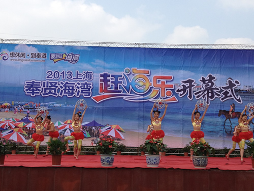 ???? 春末夏初,奉贤海湾地区又迎来了一年一度的“赶海乐”活动。4月21日上午,奉贤区青少年活动中心学生舞蹈艺术团应邀参加由奉贤区海湾旅游局管委会主办的“赶海乐”开幕式表演活动。走进露天的自然大草坪的风筝放飞场,只见风筝漫天飞舞,跑道上奔跑有力的运动员们,个个象展翅的小鸟那样快乐。舞蹈队学员们一进场就娴熟地准备起来,待一切准备就序,舞蹈队以 “快乐滚灯娃”的特色原创舞蹈拉开了“赶海乐”的序幕。队员们在悠扬的音乐中舞动着,灿烂的笑容,灵活的舞姿,使全场群情激昂,给开幕式增添了亮丽风采。