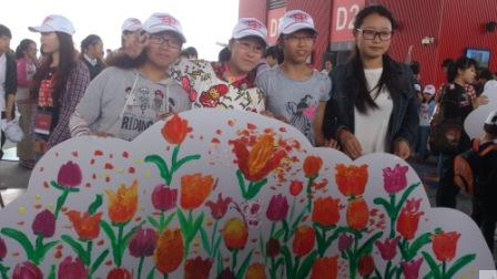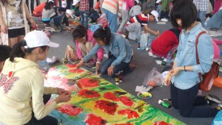 ?长宁区少年宫创作的主题是“花海”,孩子们充分发挥艺术天赋和能力,即兴挥毫,不用打形,不用勾勒,完全了然于心,胸有成竹,一堆堆颜色、一片片花儿栩栩如生,在阳光下茁壮成长,正如我们的这一代祖国的花朵般艳丽。艺术家们也来到孩子中,耐心地指点、讲解。
