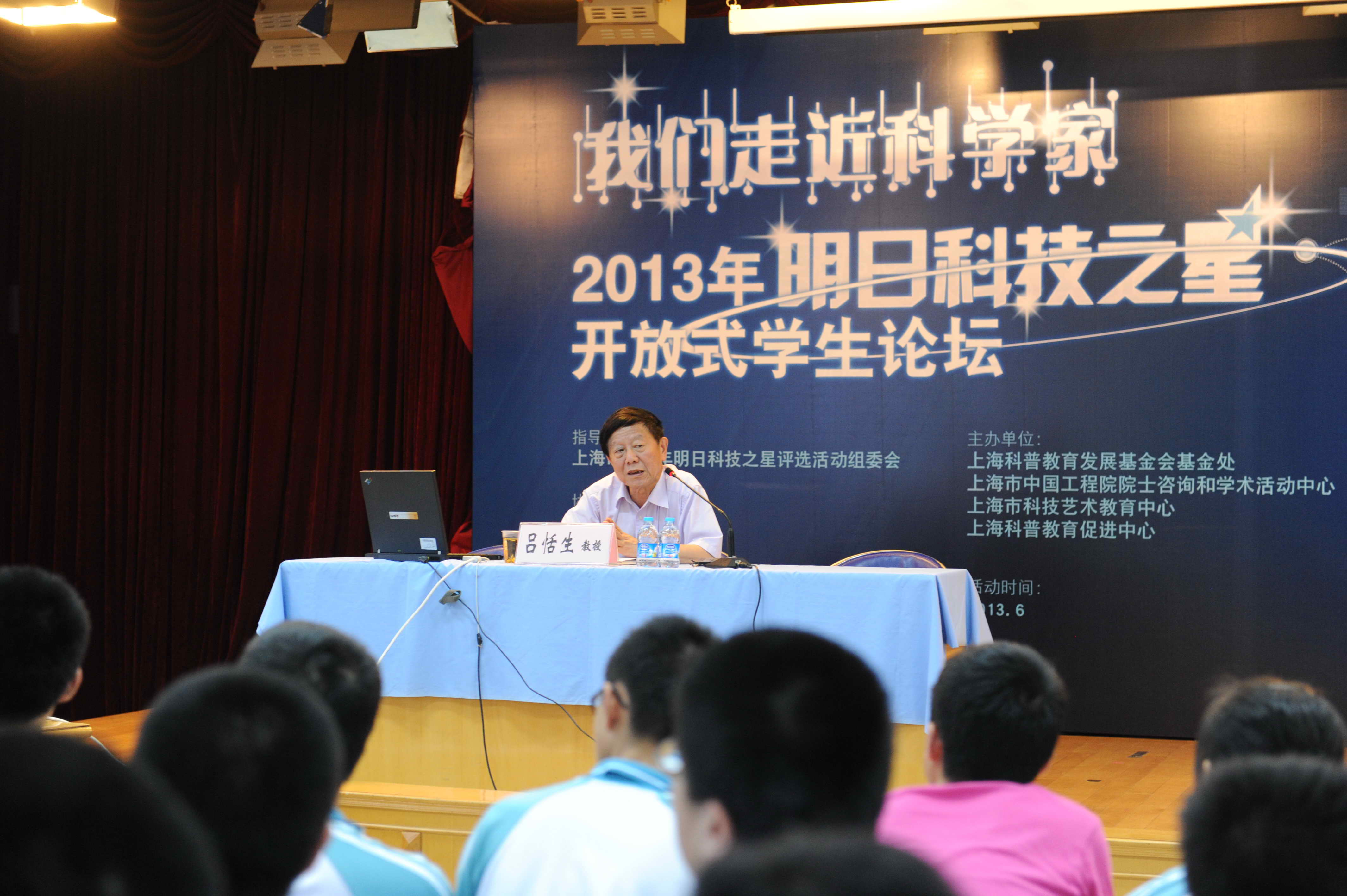2013年6月25日下午,2013年明日科技之星开放式学生论坛首期活动——我们走近科学家系列讲座在长宁区少年科技指导站多功能厅开讲,中国科学院上海技术物理研究所褚君浩院士和交通大学吕恬生教授分别为同学们带来了精彩的科技讲座,来自全市的400多位中学科技爱好者和指导教师共享了这场科普盛宴。??