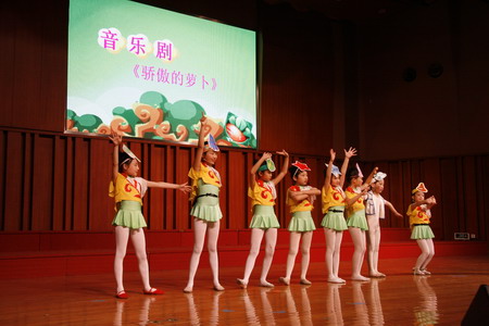 在杨浦区少年宫学生民乐团、上海市学生民乐二团演奏的经典曲目《沙迪尔传奇》的音乐声中,活动拉开了帷幕。一个个孩子登台亮相,带来了自己精心准备的节目。有独唱《小背篓》、《山路弯弯》,有弦乐合奏、重奏,有舞蹈群舞、双人舞等,还有儿童音乐剧《骄傲的萝卜》。这出音乐剧灵感来源于孩子们爱玩的游戏《保卫萝卜》,通过剧中孩子们生动有趣的演绎,使游戏中各种卡通形象活灵活现地展现在我们眼前,从而揭示了只有团结集体的力量才能战胜困难,取得成功和胜利的深刻道理。孩子的精彩演出,赢得了台下观众的热烈的掌声。