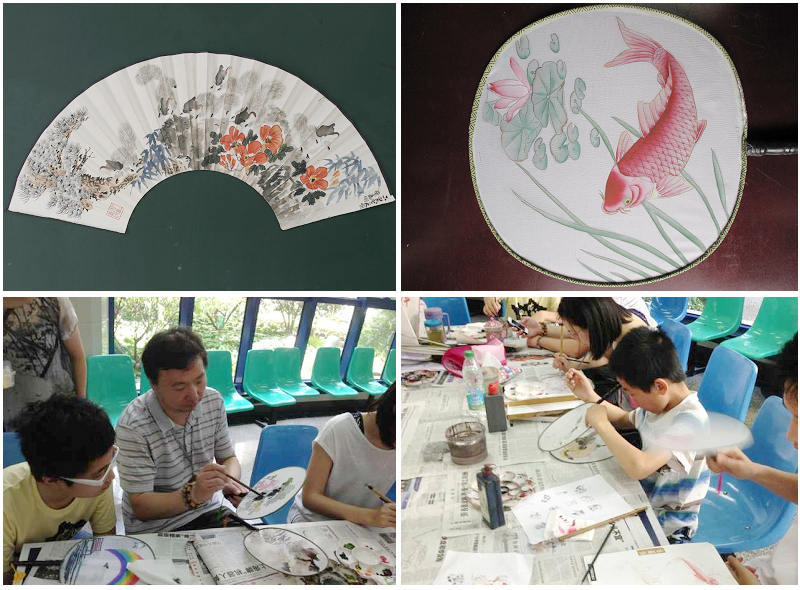 中国扇文化起源于远古时代,我们的祖先在烈日炎炎的夏季,随手猎取植物叶或禽羽,进行简单加工,用来挡住太阳产生风,这便是扇子的初源。扇面秀活动,是把创意作品画在扇面上,别具一格。书画组的黄晖老师为学生们一一指导并进行修善,一幅幅学生得意的扇面作品就此诞生啦!