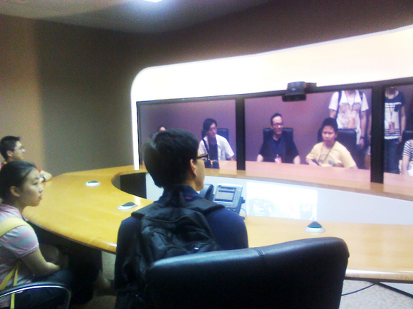 ?师生们还参观了视频会议区,体验了由电信高带宽支持的远程视频会议,一比一的高清画晰,完全没有延时。