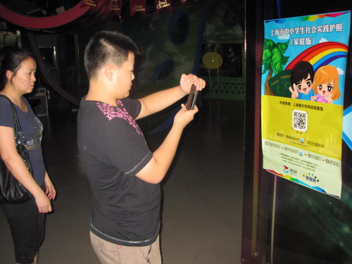 今年小朋友们所持的护照可是与众不同哦。当中有上海市科委的参观护照,也有黄浦区文明办、教育局的学生社会实践护照,还有黄浦区科协家庭护照、教委和校外联合会家庭护照等等。另外,今年的科普护照纷纷加入了先进的二维码数码扫描技术,同学们和家长纷纷掏出自己的智能手机,在探索馆门口张贴的场馆二维码海报前进行扫描签到。当中就有由上海市教委和上海市青少年学生校外活动联席会议办公室颁发的《上海市中小学生社会实践基地家庭护照》。